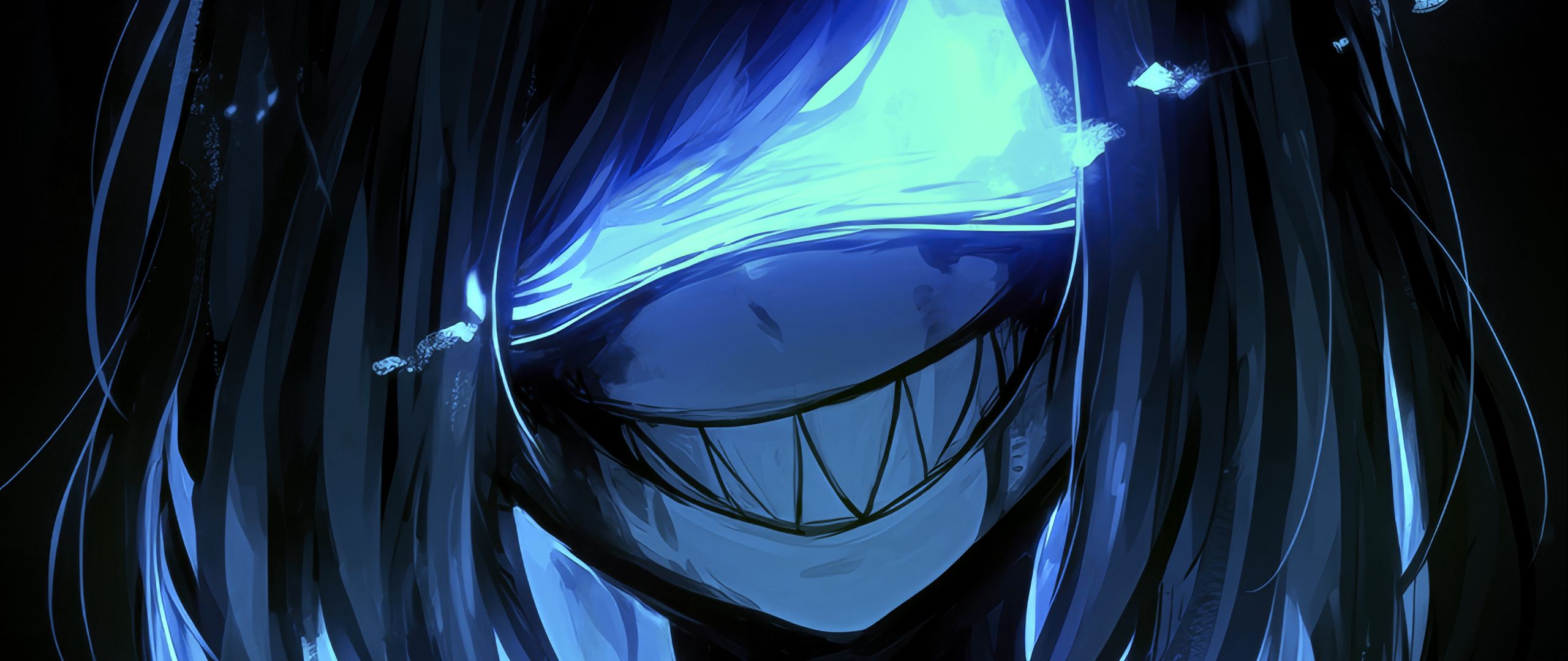 2560x1080 монстр, улыбка, зубы, маска, арт, аниме, синий обои два монитора 1080p