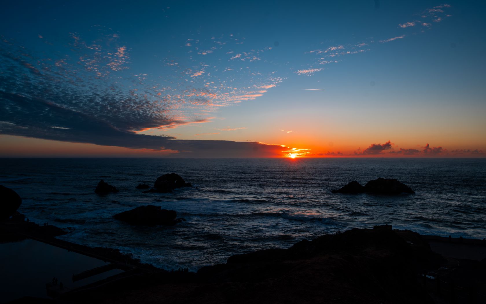 1680x1050 море, горизонт, солнце, закат, облака, пейзаж, темный обои 16:10
