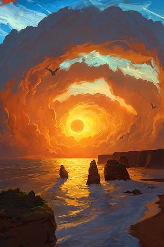 320x480 море, закат, арт, скалы, небо, облака, пейзаж обои samsung galaxy ace gt-s5830, sony xperia e, miro, htc wildfire s, c, lg optimus