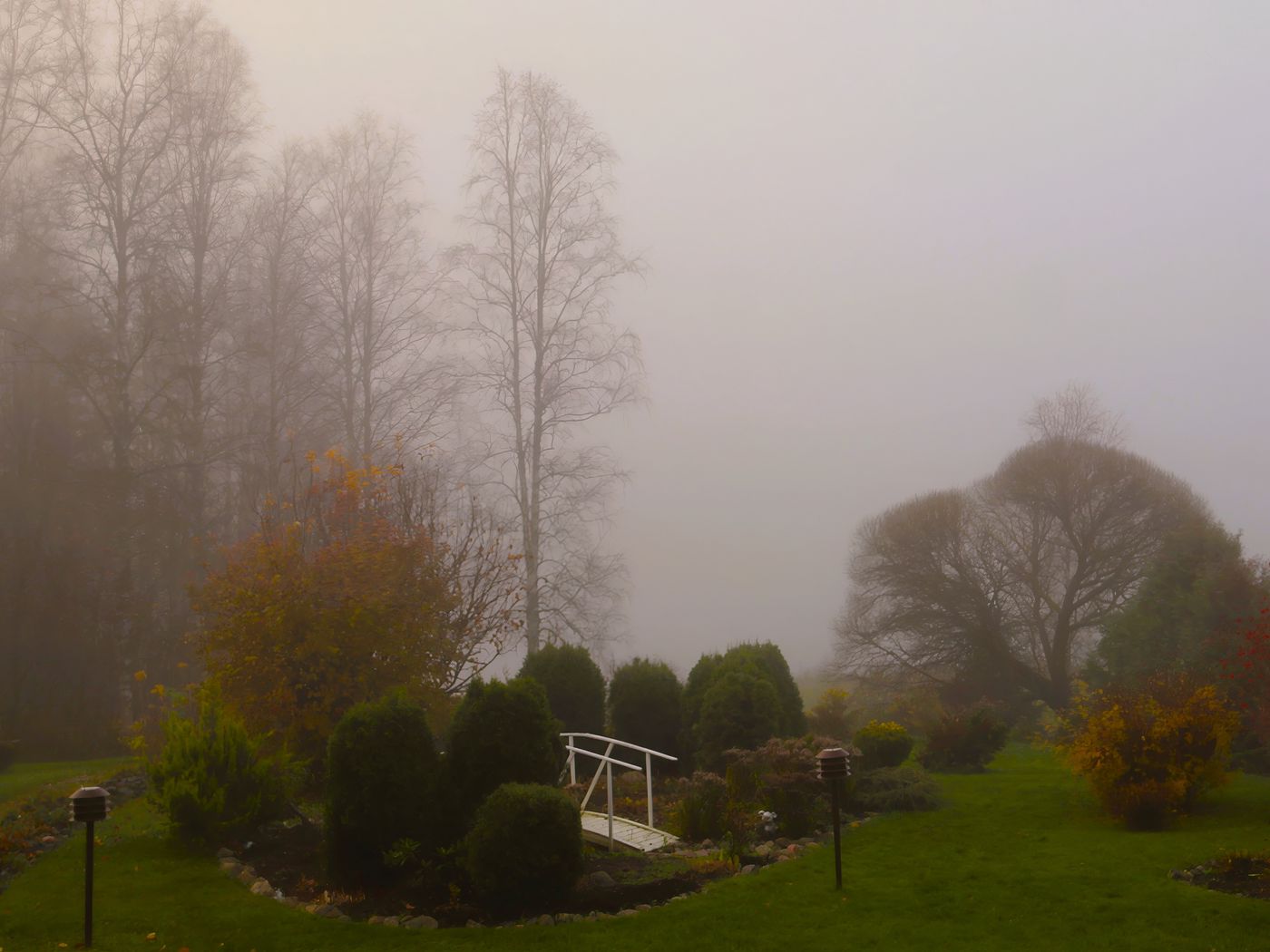 1400x1050 мост, деревья, туман, осень обои стандарт 4:3