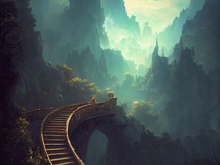 320x240 мост, лестница, горы, туман, пейзаж, фантастика, арт обои nokia e72, e71, asha, alcatel onetouch