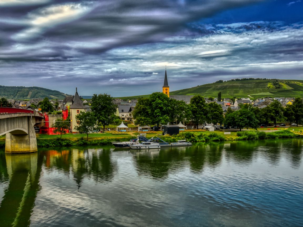 1152x864 мост, река, теплоходы, здания, деревья, облака, пейзаж обои стандарт 4:3