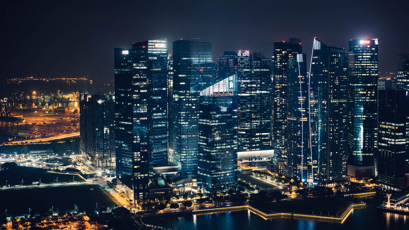 1600x900 небоскребы, ночной город, вид сверху обои 16:9