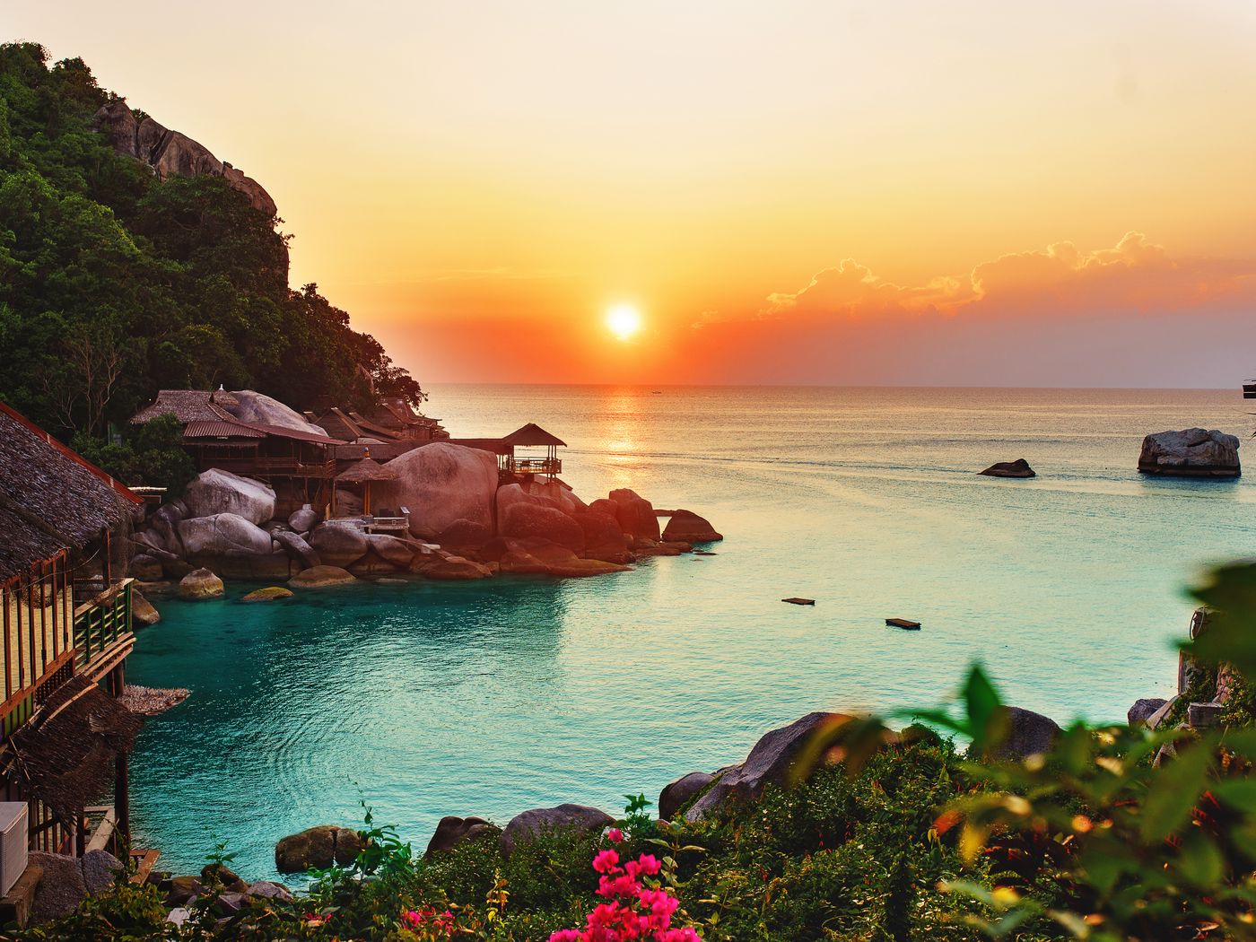 1400x1050 океан, горизонт, закат, пляж, растительность обои стандарт 4:3