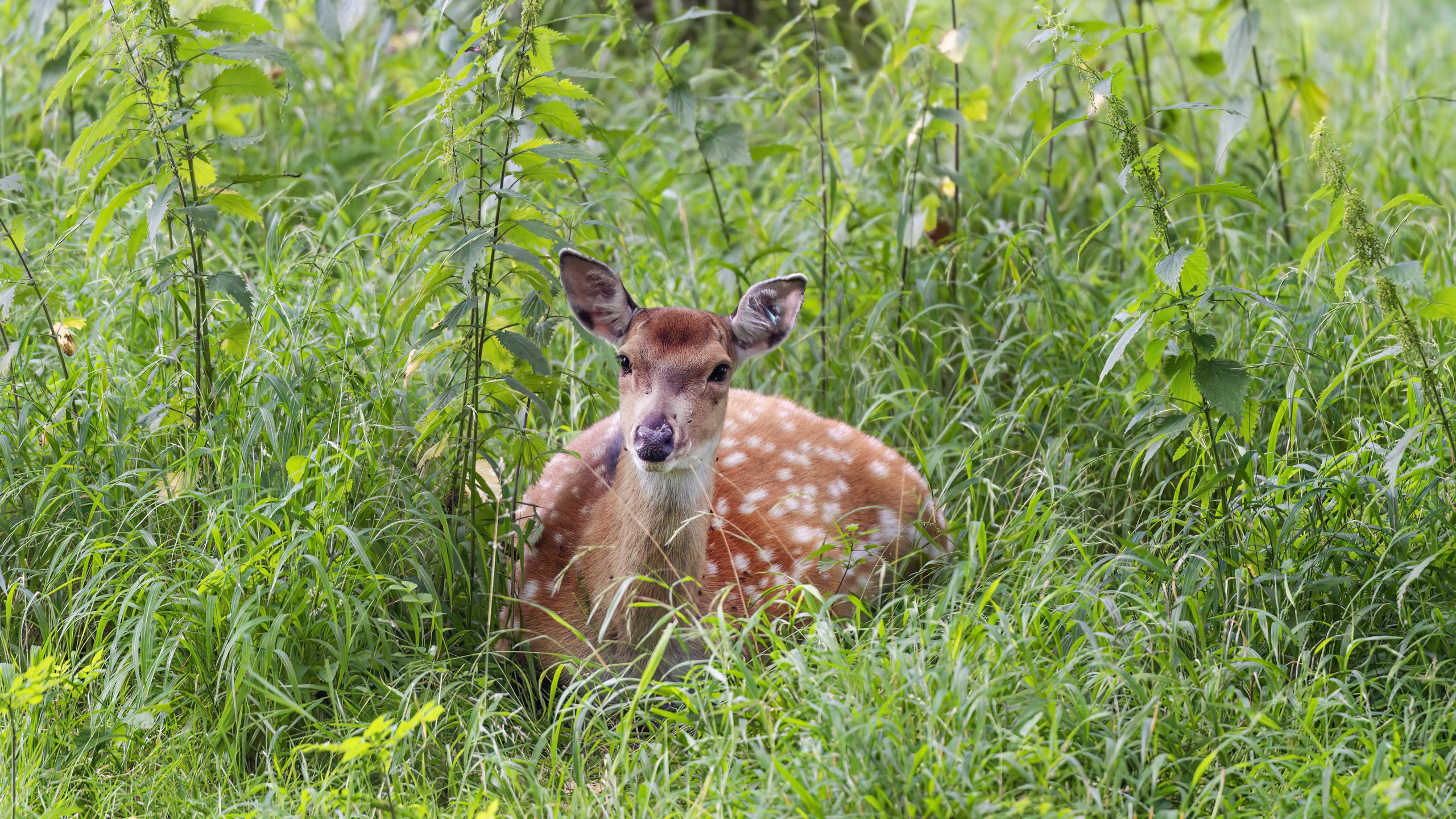 2560x1440 олень, трава, лес, животное, дикая природа обои 16:9