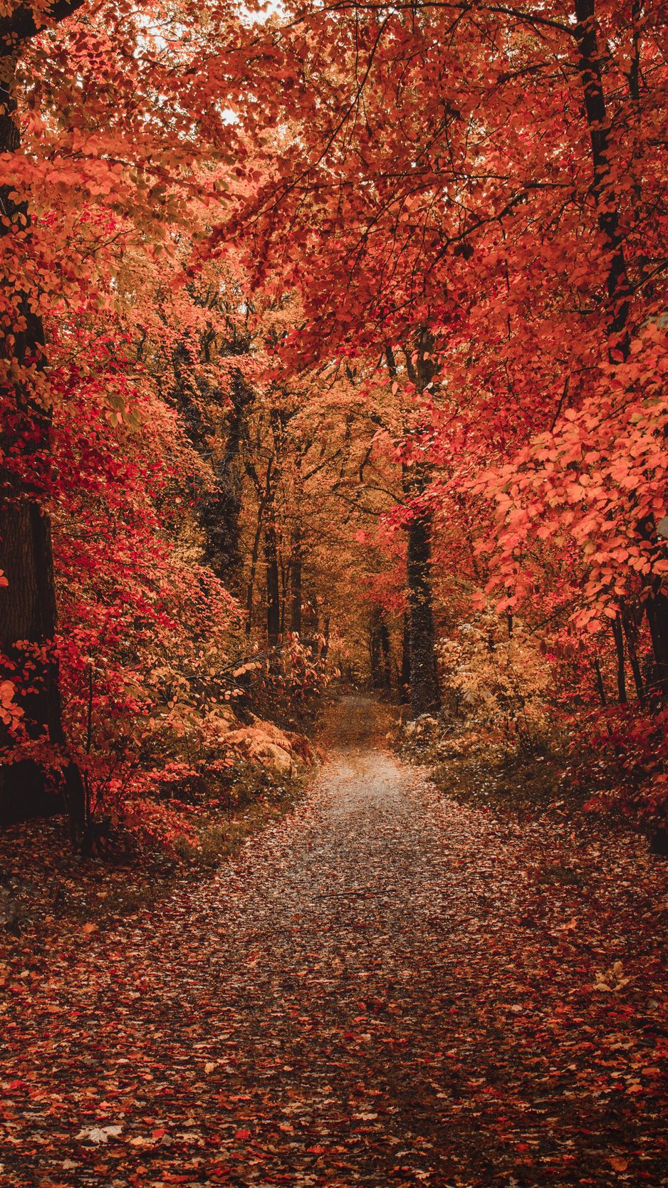 938x1668 осень, лес, тропинка, листва, деревья, осенние краски обои iphone 8/7/6s/6 for parallax