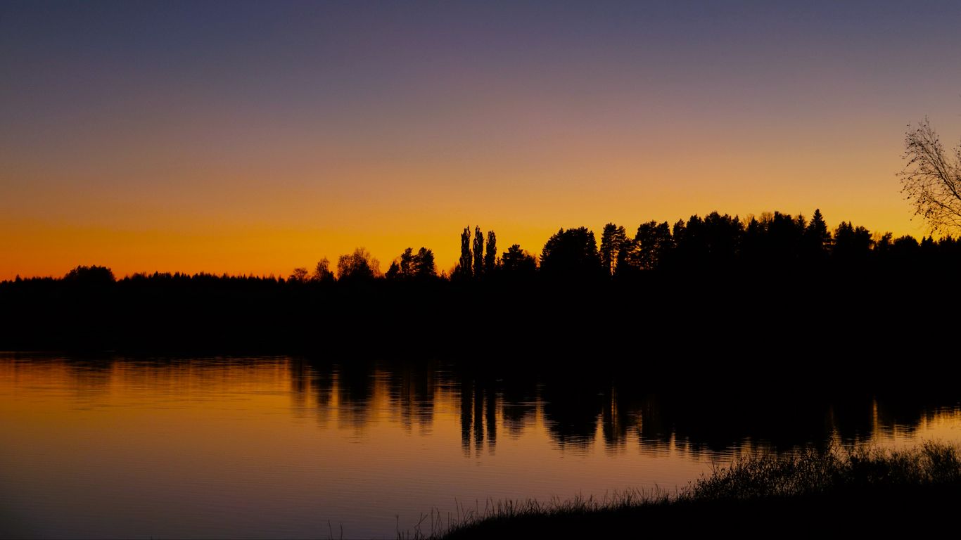 1366x768 озеро, деревья, лес, закат обои планшет, ноутбук