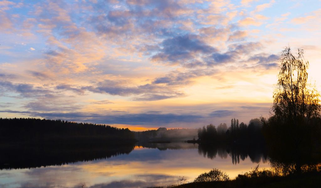 1024x600 озеро, деревья, лес, облака, закат, отражение, природа обои нетбук, планшет