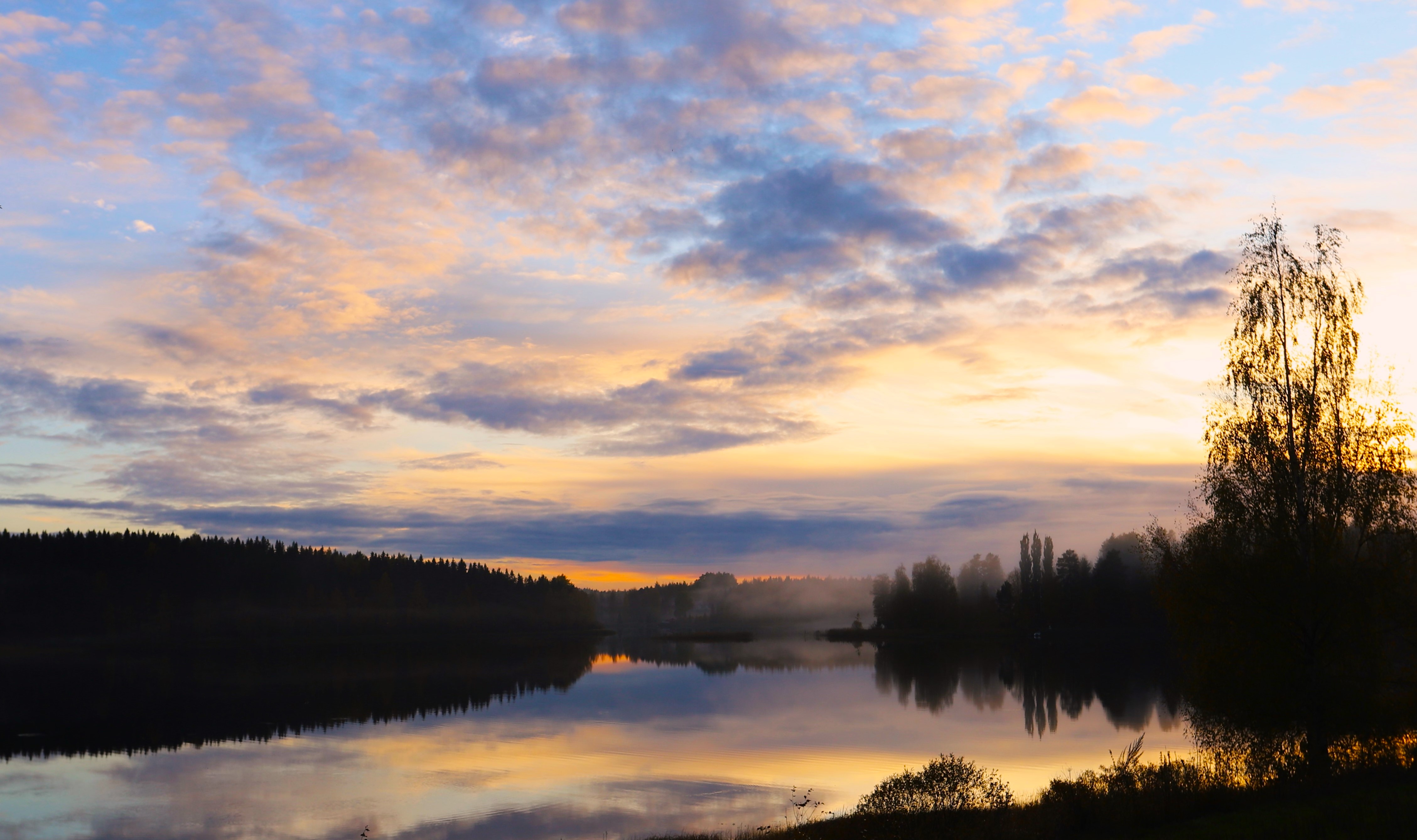 4514x2676 озеро, деревья, лес, облака, закат, отражение, природа обои