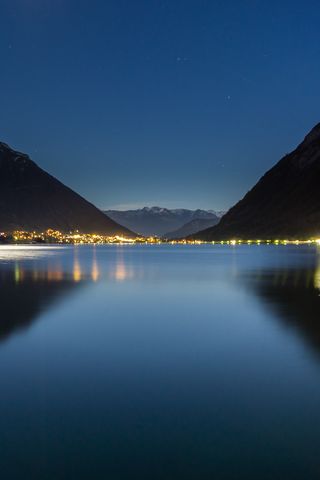 320x480 озеро, горы, город, огни, ночь, отражение обои samsung galaxy ace gt-s5830, sony xperia e, miro, htc wildfire s, c, lg optimus