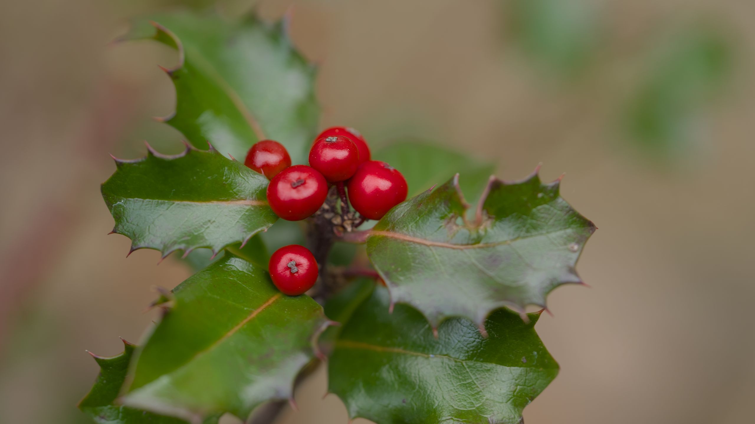 2560x1440 падуб, ягоды, листья, макро обои 16:9