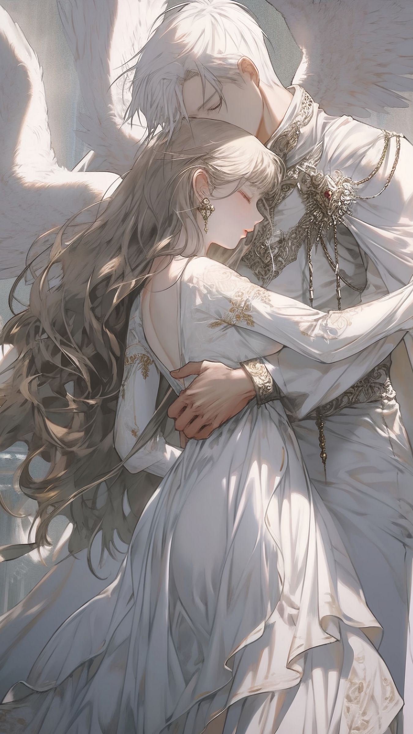 1350x2400 пара, крылья, ангелы, объятия, любовь, белый, аниме обои iphone 8+/7+/6s+/6+ for parallax