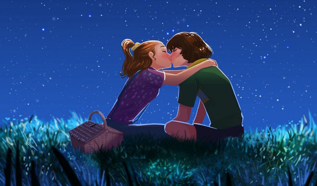 1024x600 пара, поцелуй, арт, звездное небо, романтика обои нетбук, планшет