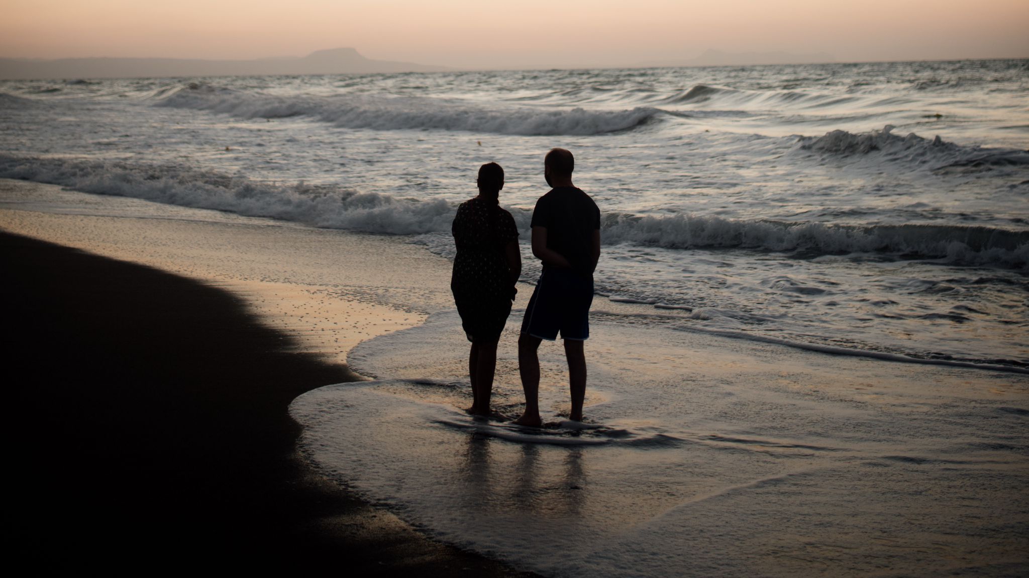 2048x1152 пара, силуэты, побережье, море, сумерки, темный обои ультраширокий монитор