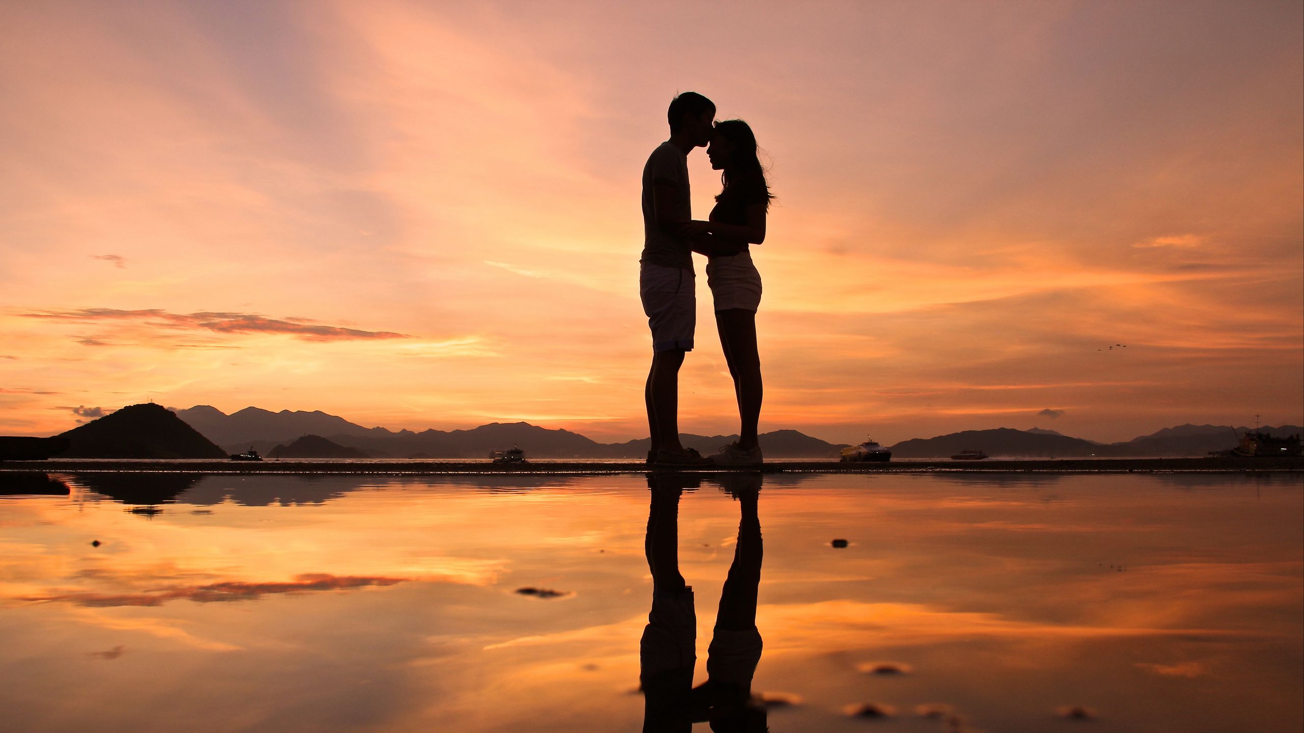 2560x1440 пара, силуэты, поцелуй, любовь, побережье, сумерки, темный обои 16:9