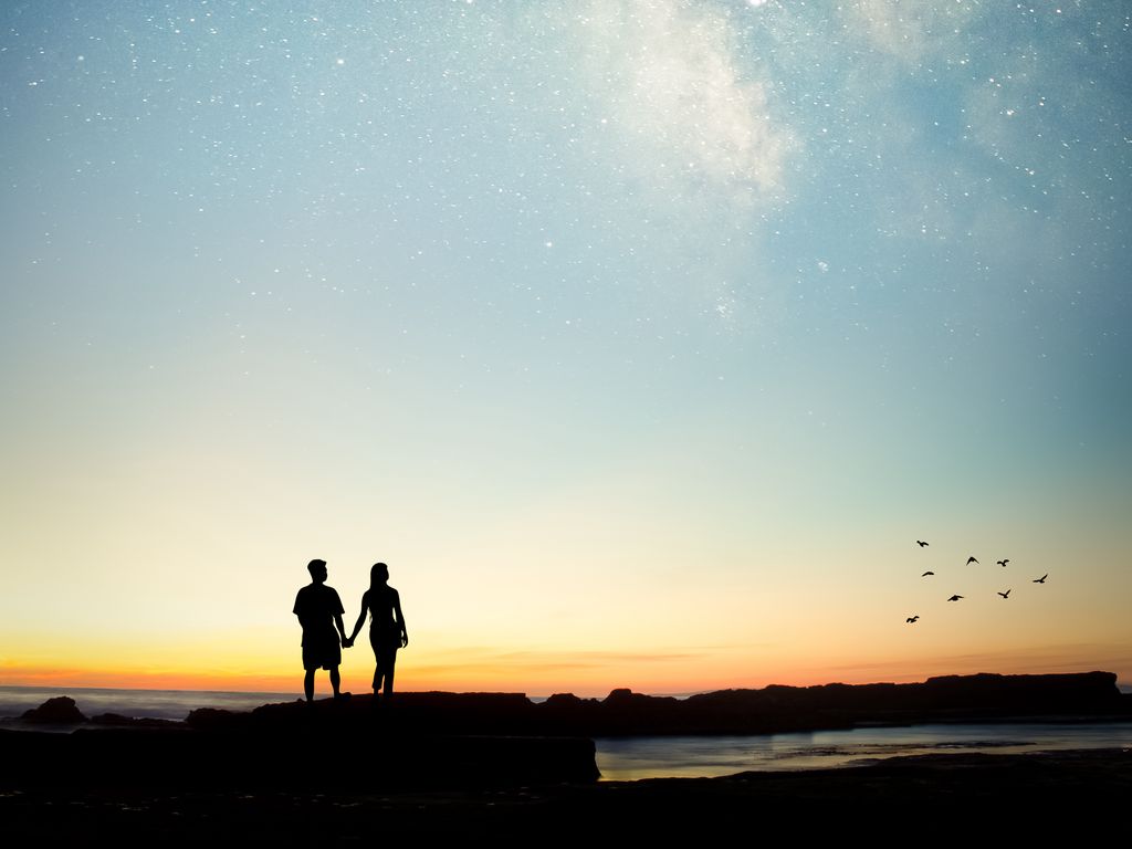 1024x768 пара, силуэты, сумерки, горизонт, млечный путь, любовь обои стандарт 4:3