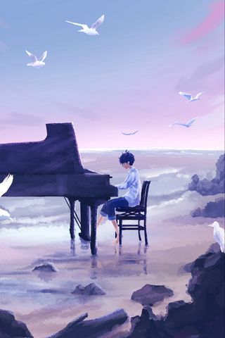 320x480 парень, музыкант, рояль, птицы, аниме, арт обои samsung galaxy ace gt-s5830, sony xperia e, miro, htc wildfire s, c, lg optimus