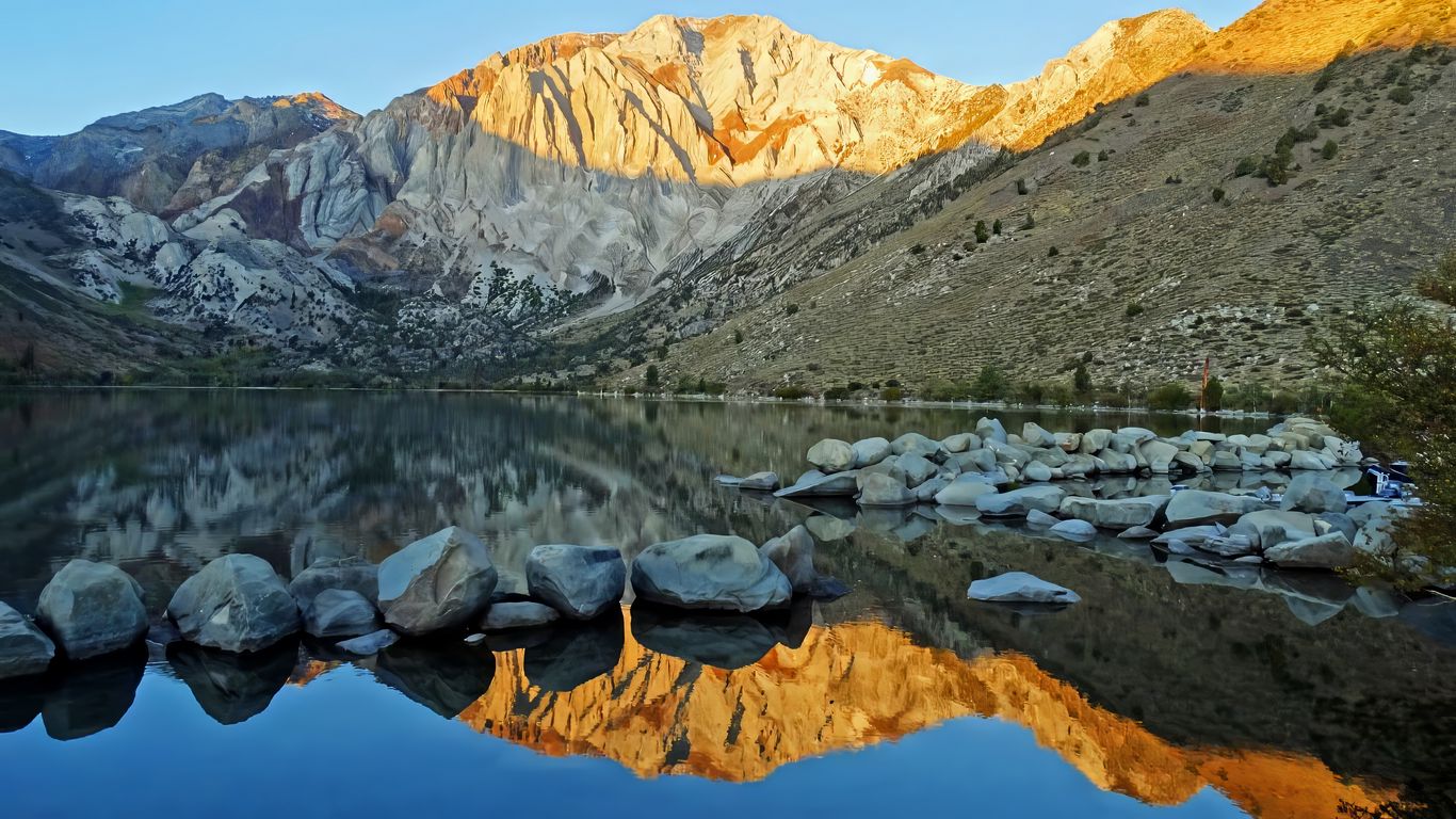 1366x768 пейзаж, горы, камни, отражение, озеро, природа обои планшет, ноутбук