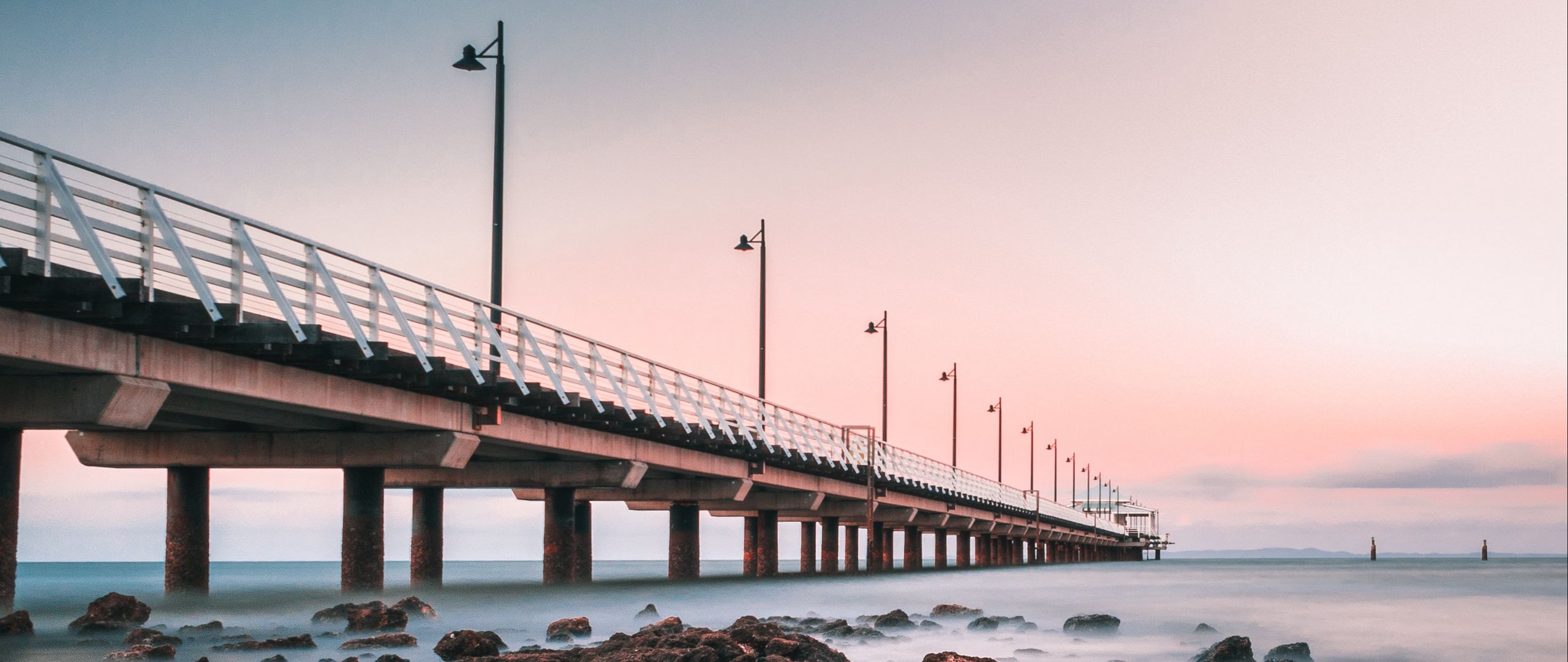 2560x1080 пирс, море, горизонт, камни обои два монитора 1080p