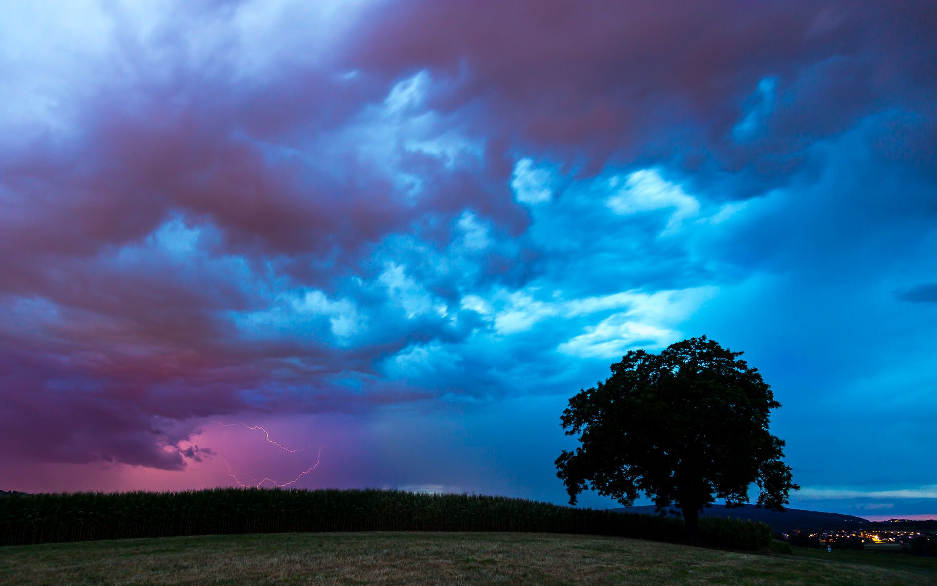 1920x1200 поле, облака, молнии, шторм, дерево обои 16:10