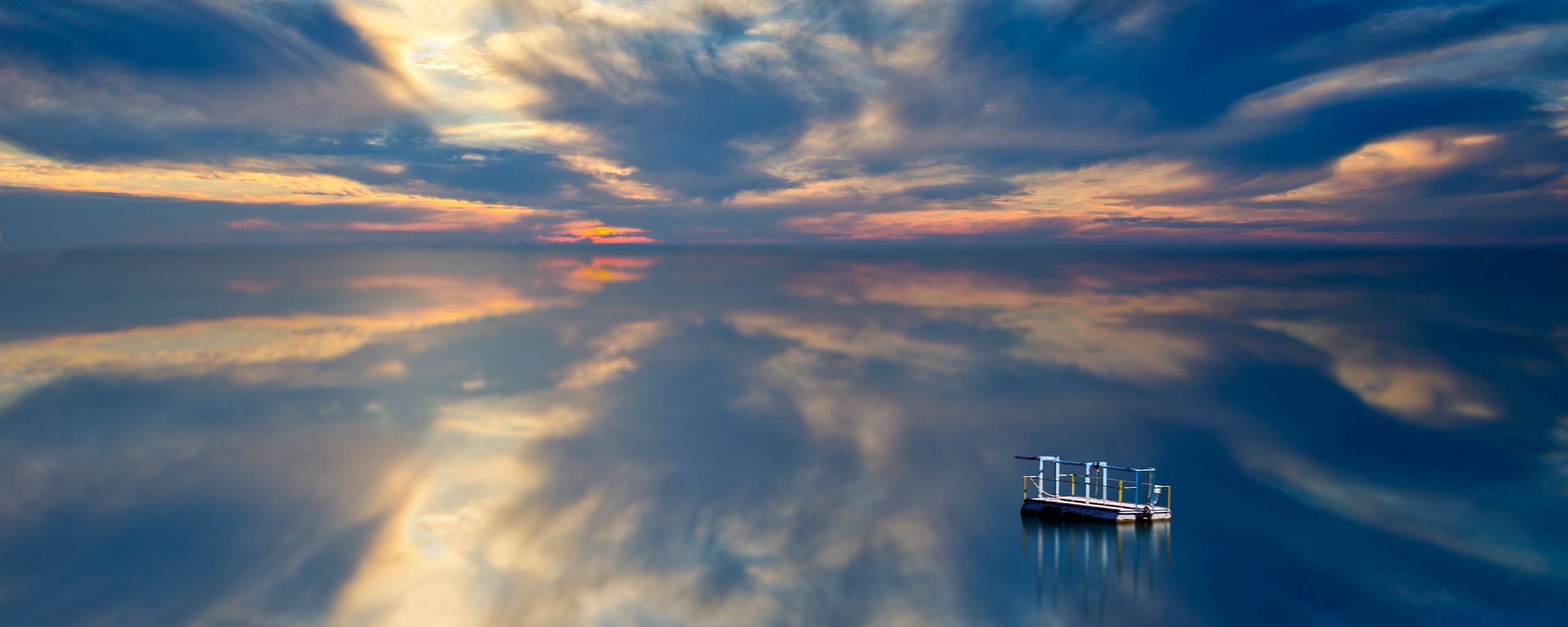 2560x1024 понтон, плот, море, горизонт, закат обои ультраширокий монитор