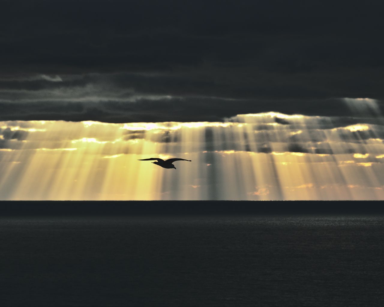 1280x1024 птица, море, сумерки, небо, облака, солнечные лучи обои стандарт 5:4