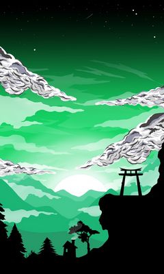 240x400 рассвет, горы, дом, деревья, арт, зеленый, черный обои nokia asha 311, samsung galaxy 580, omnia, lg kp500