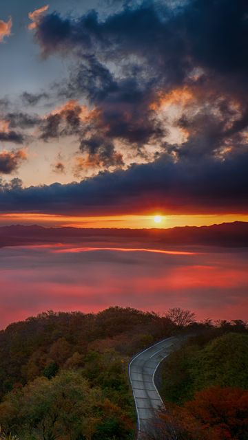 360x640 рассвет, горы, горизонт, облака, солнечные лучи, дорога обои nokia n8, c5, c6, c7, e7, x6 nokia 5800, 5230, 5228, sony ericsson vivaz