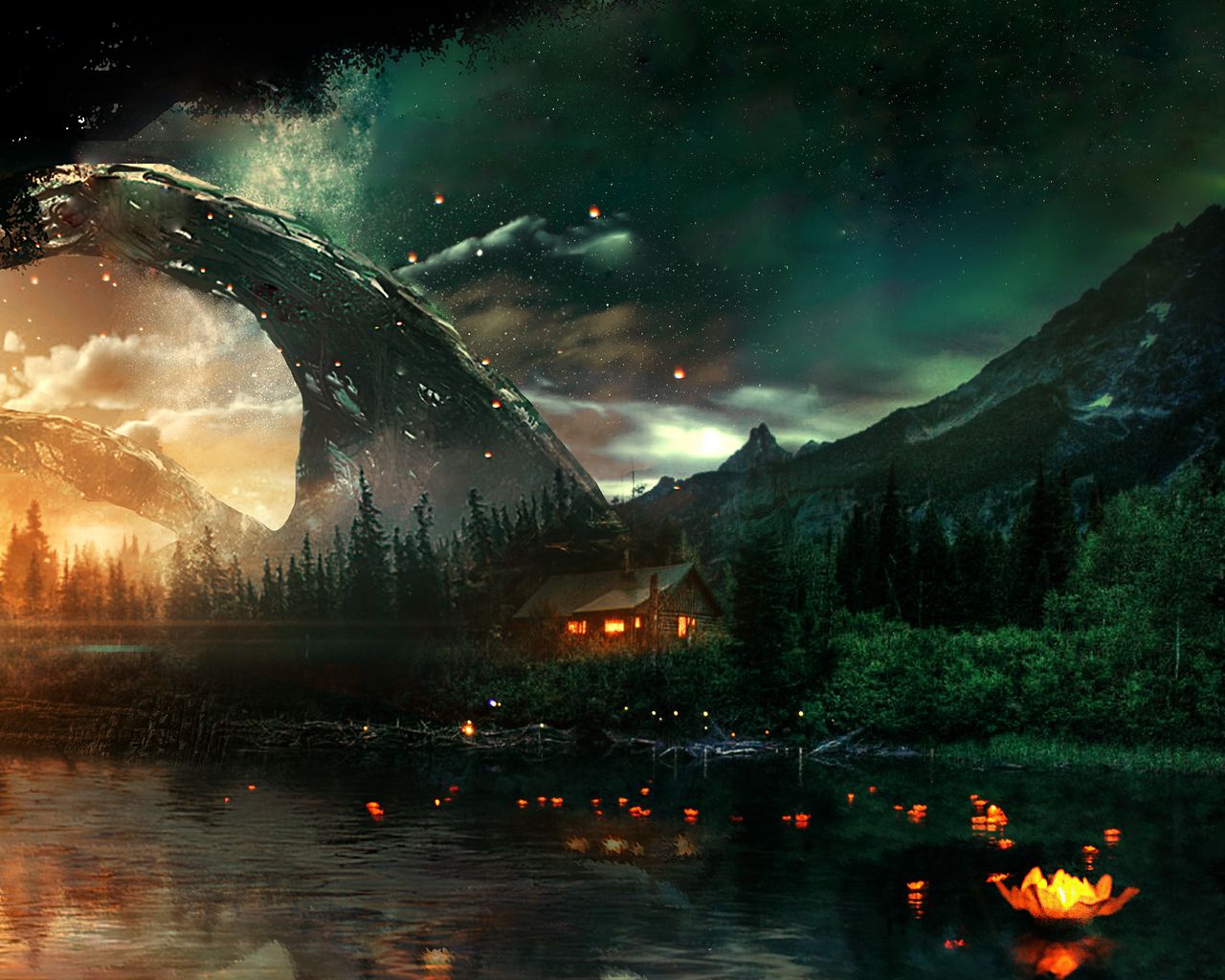 1280x1024 река, домик, арт, ночь, звездное небо, фантастический обои стандарт 5:4