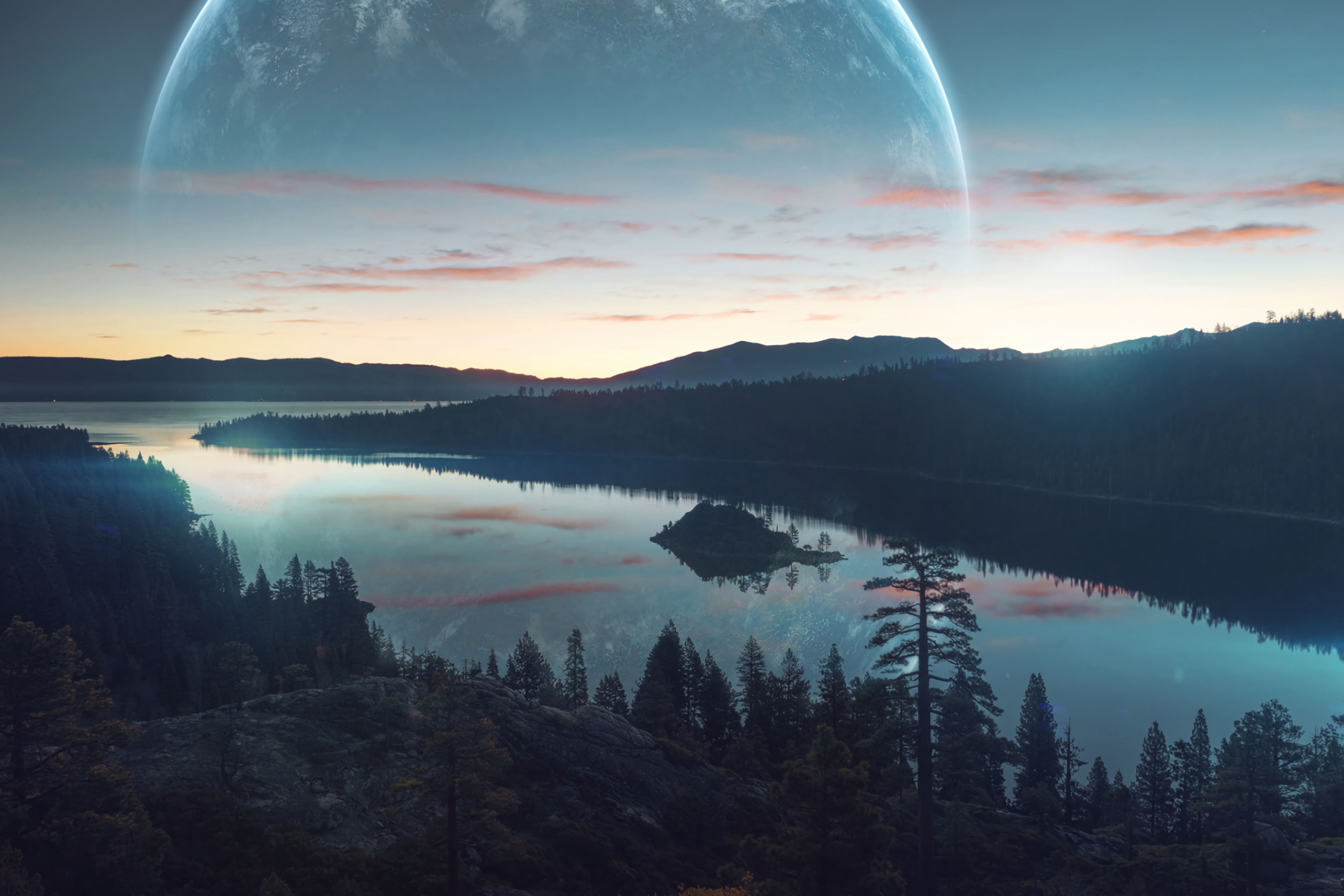 3600x2400 река, лес, горы, небо, закат, отражение, фантастический обои