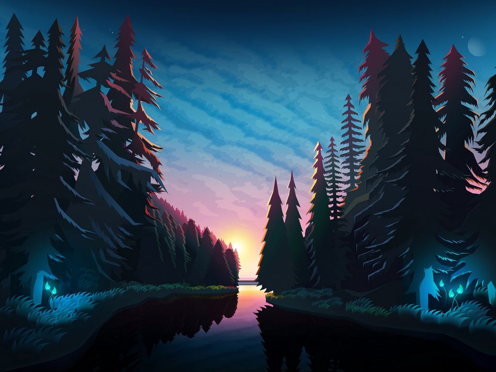 1024x768 река, лес, закат, пейзаж, арт обои стандарт 4:3