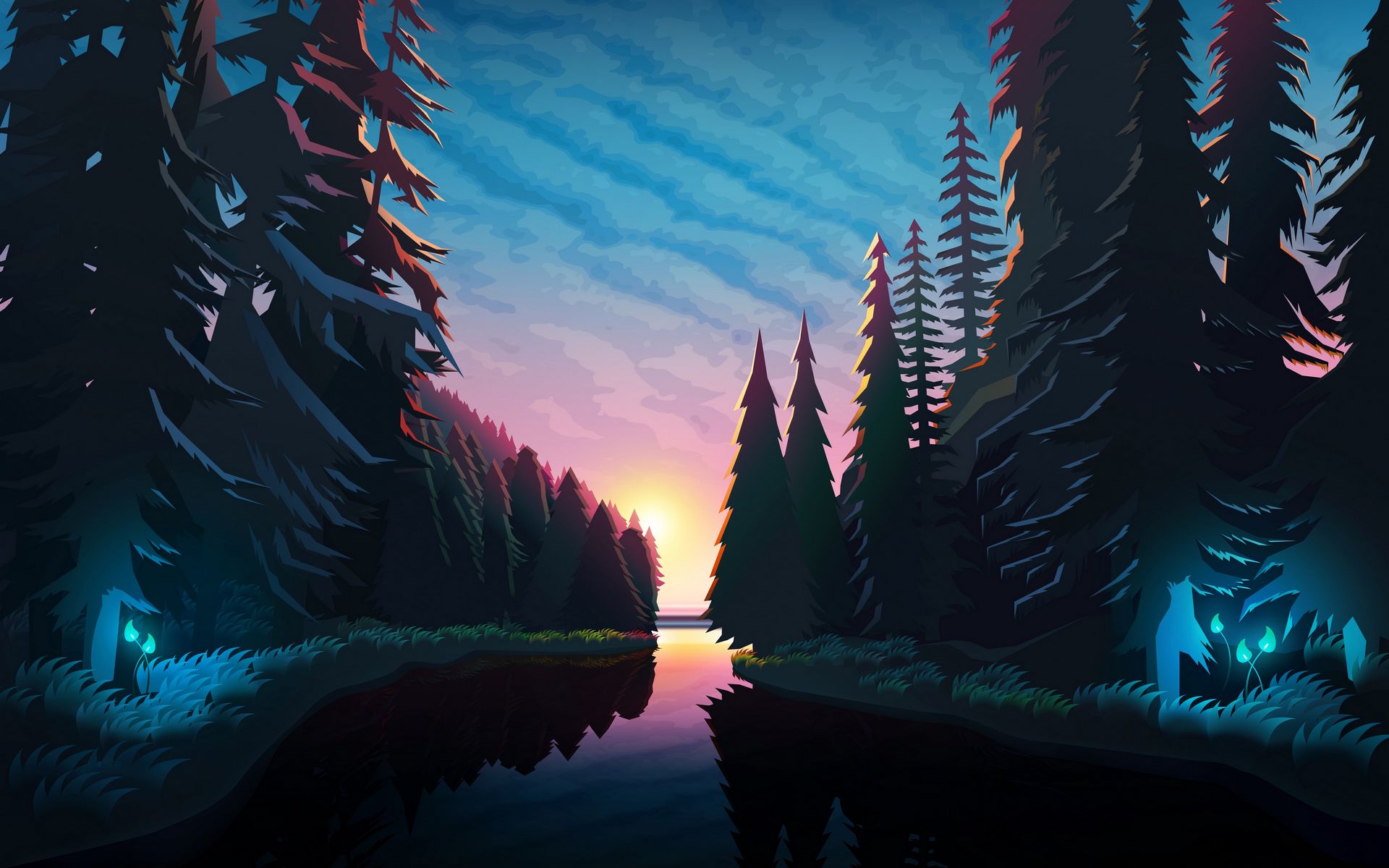 1920x1200 река, лес, закат, пейзаж, арт обои 16:10
