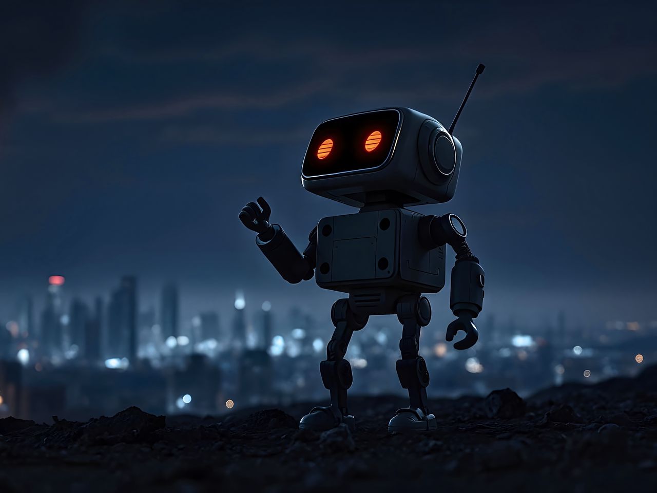 1280x960 робот, город, ночь, огни, размытие обои стандарт 4:3
