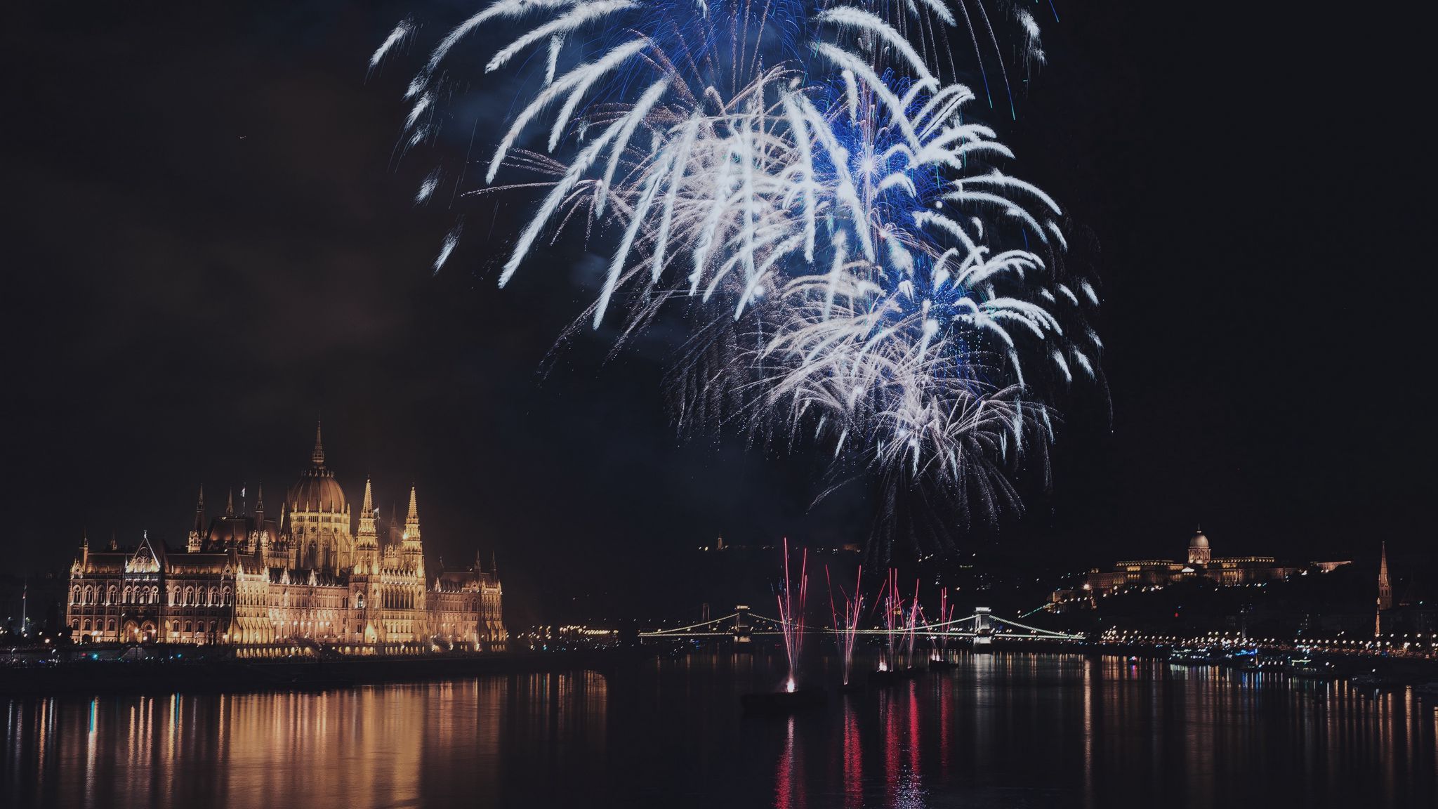2048x1152 салют, ночной город, празднование, будапешт, венгрия обои ультраширокий монитор