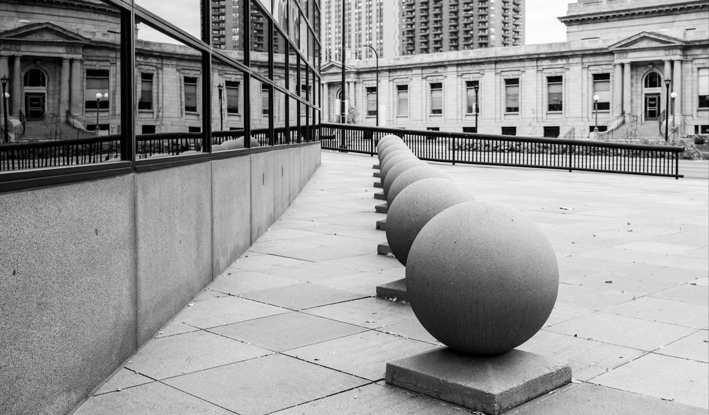 1024x600 шары, архитектура, город, здания, отражение, улица, чб, миннеаполис, сша обои нетбук, планшет