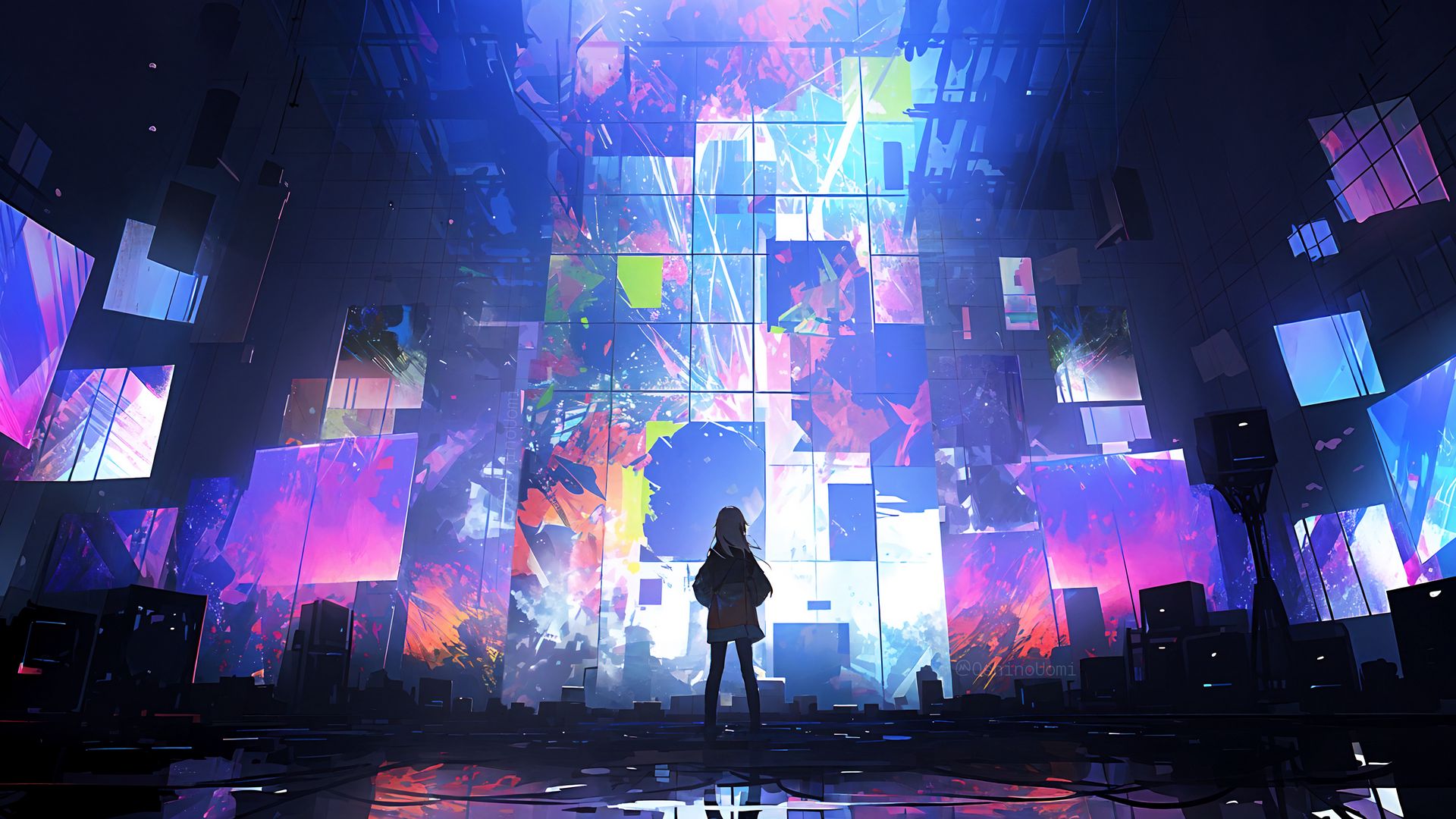 1920x1080 силуэт, стена, экраны, свечение, аниме, арт обои full hd, hdtv, fhd, 1080p