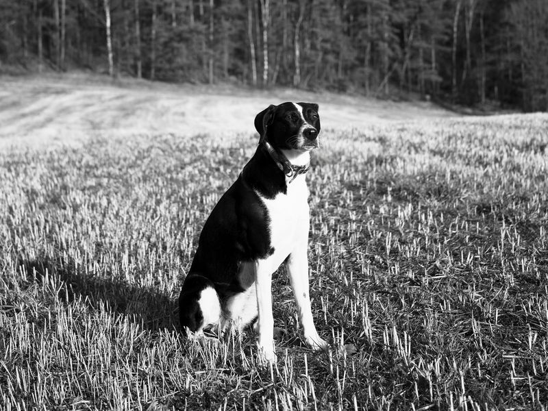 800x600 собака, питомец, поле, лес, чб обои pocket pc, pda, кпк