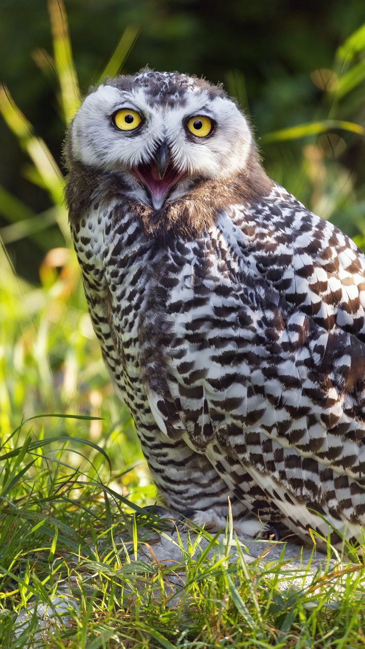 720x1280 сова, клюв, перья, птица, трава обои samsung galaxy mini s3, s5, neo, alpha, sony xperia compact z1, z2, z3, asus zenfone