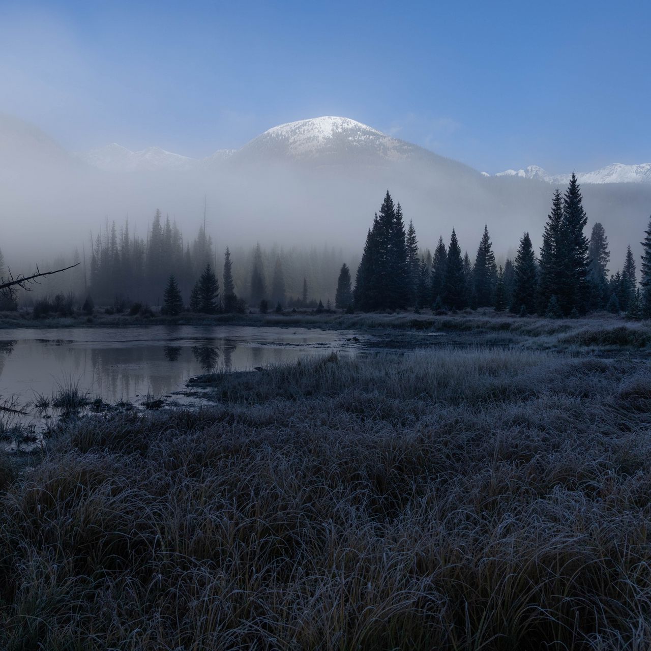 1280x1280 трава, озеро, деревья, лес, туман, горы, пейзаж, темный обои ipad, ipad 2, ipad mini for parallax
