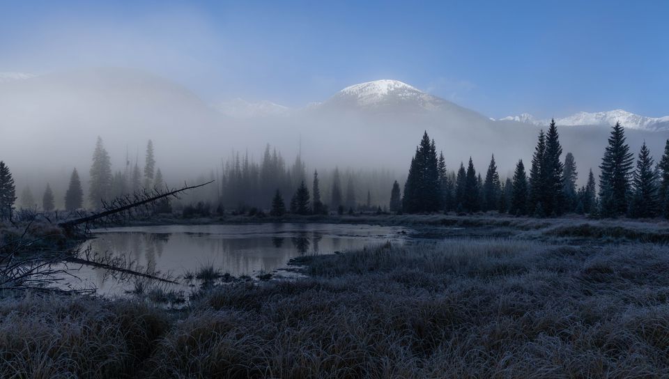 960x544 трава, озеро, деревья, лес, туман, горы, пейзаж, темный обои playstation ps vita