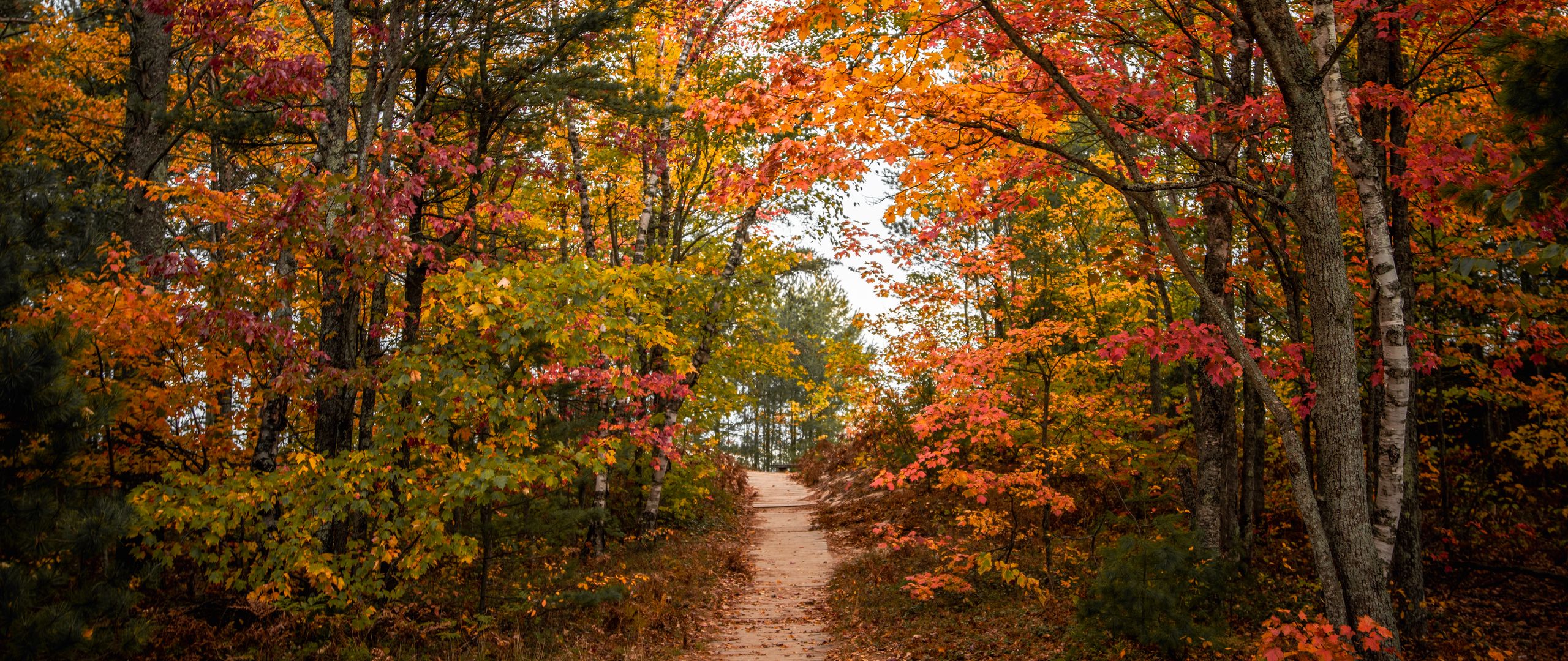 2560x1080 тропа, деревья, листья, осень, лес, природа обои два монитора 1080p