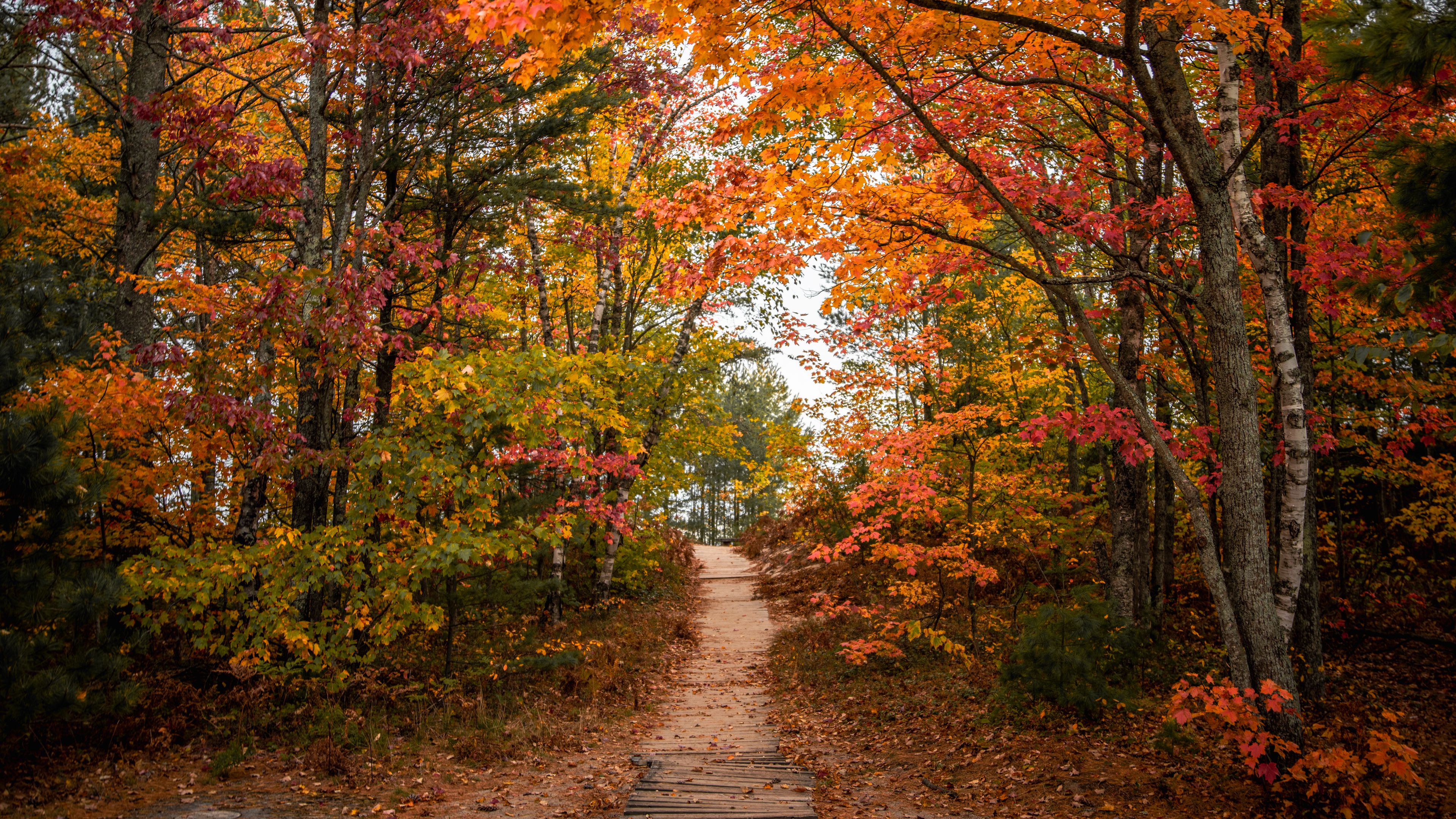 3840x2160 тропа, деревья, листья, осень, лес, природа обои 4k uhd 16:9