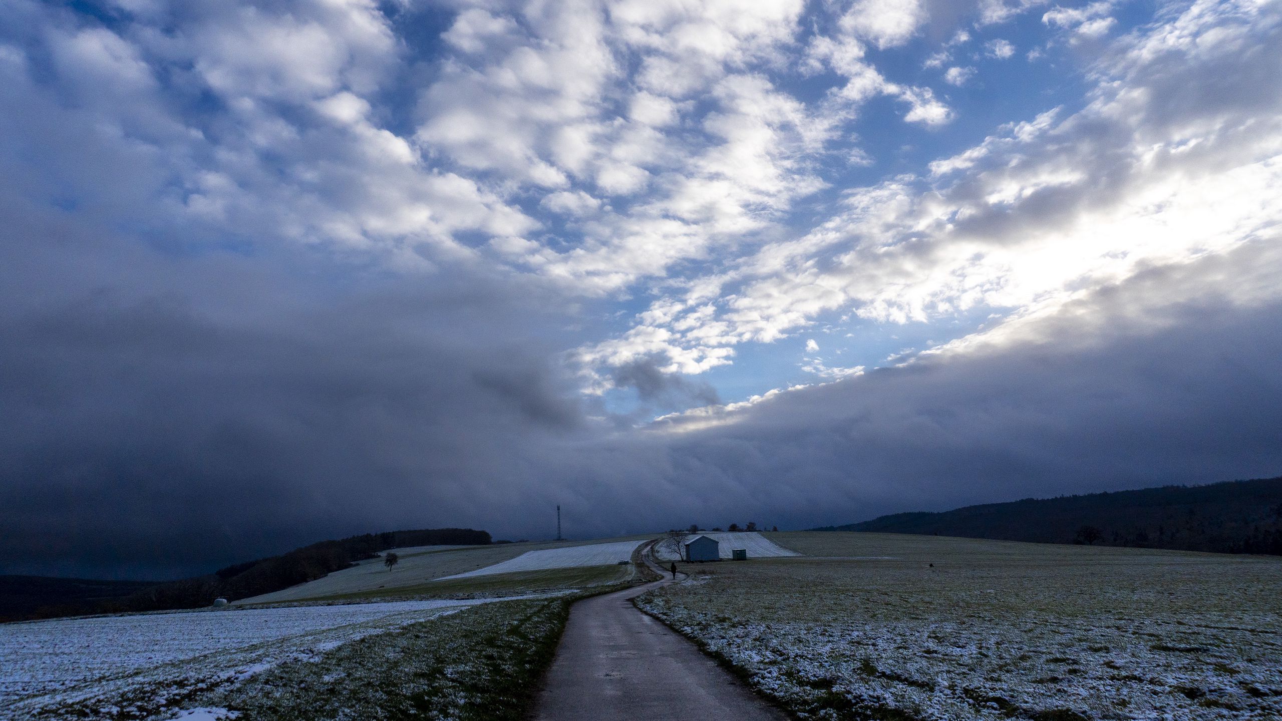 2560x1440 тропа, поле, облака, снег, зима, лес, дом обои 16:9