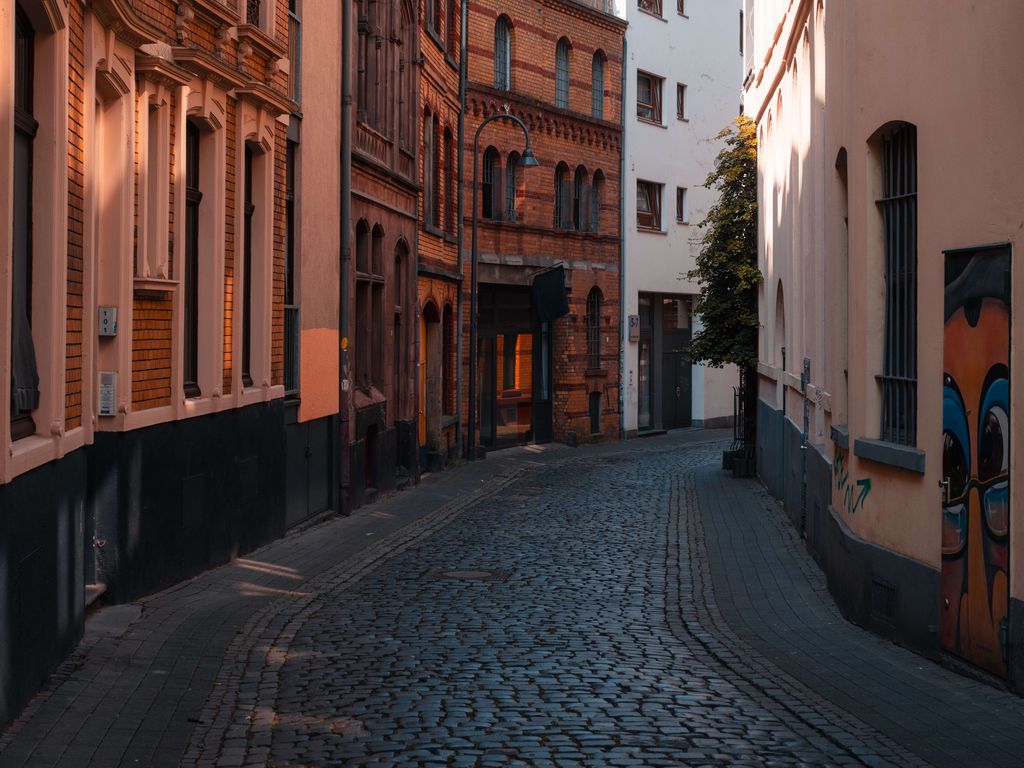 1024x768 улица, здания, брусчатка, архитектура, фонарь обои стандарт 4:3