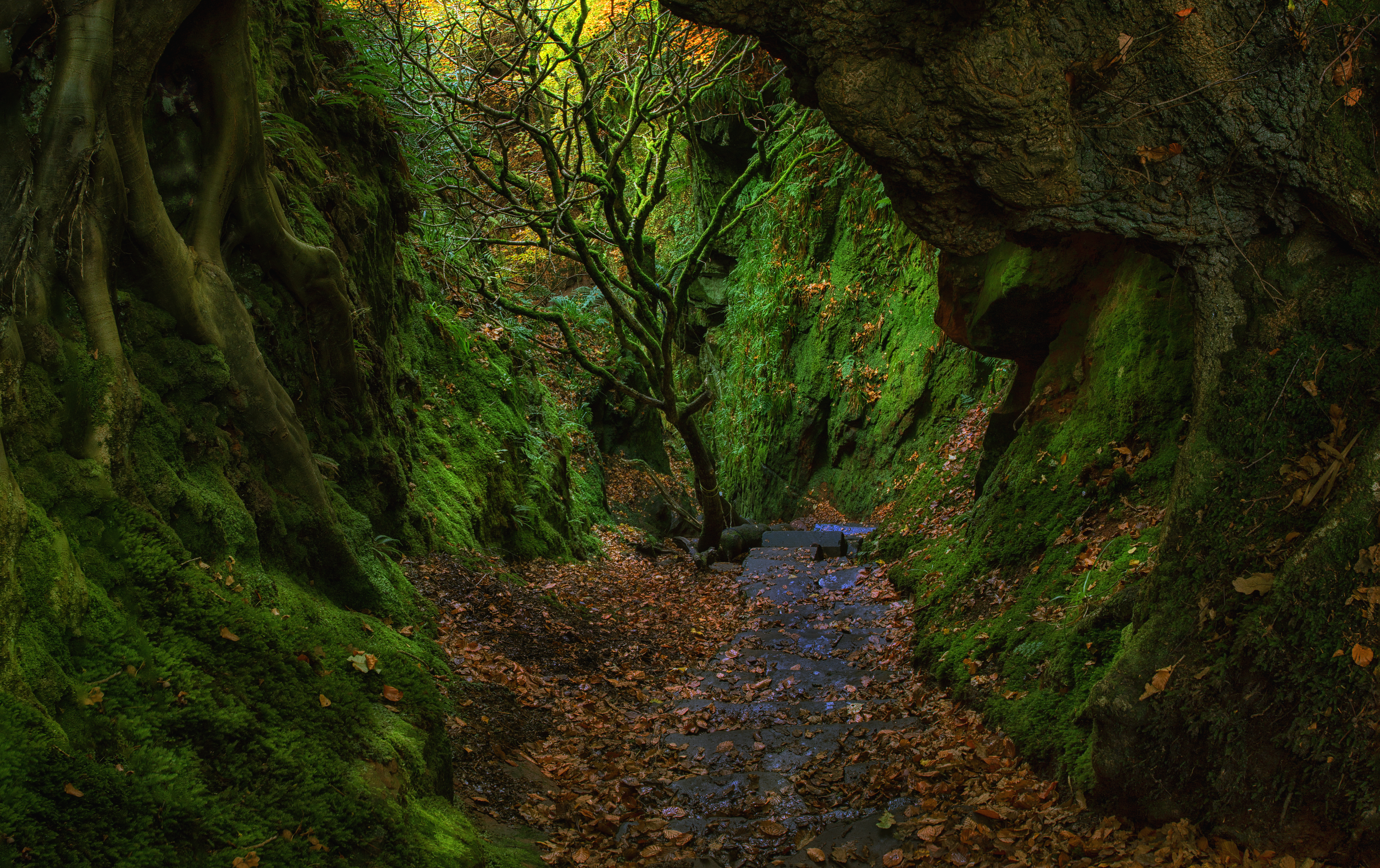 5896x3710 ущелье, лестница, листва, мох, лестница дьявола, финнич, шотландия обои