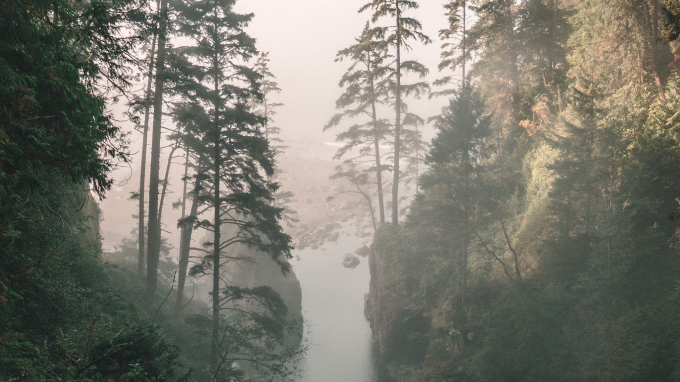 1366x768 ущелье, река, туман, скалы, деревья обои планшет, ноутбук