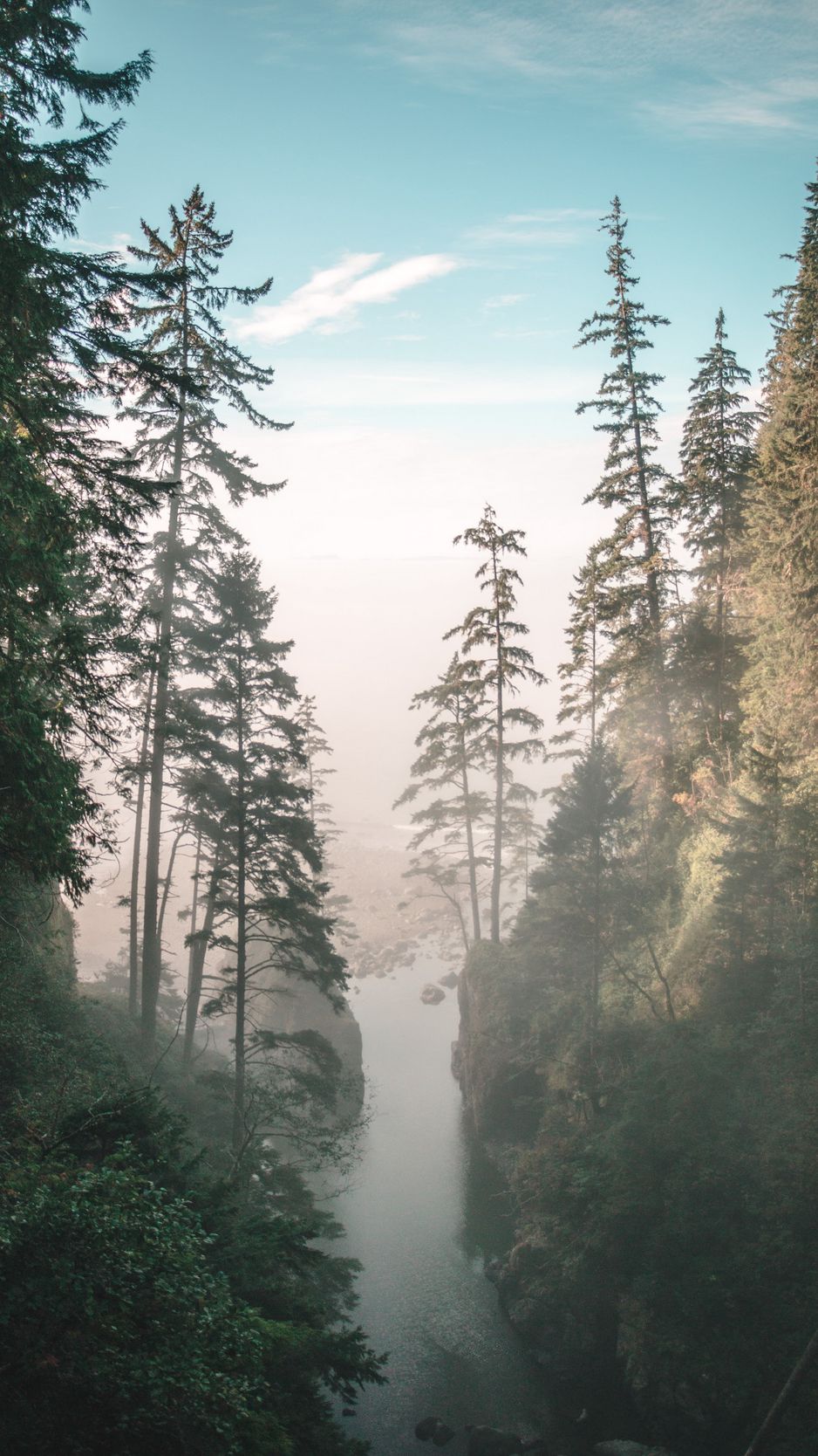 938x1668 ущелье, река, туман, скалы, деревья обои iphone 8/7/6s/6 for parallax