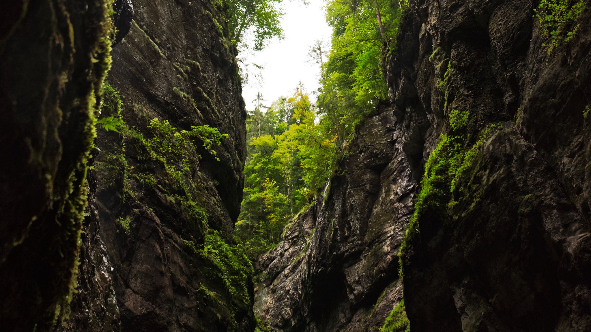 2048x1152 ущелье, скалы, деревья, горы, природа обои ультраширокий монитор