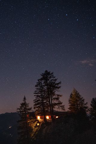 320x480 утес, дом, ночь, горы, звездное небо, свет обои samsung galaxy ace gt-s5830, sony xperia e, miro, htc wildfire s, c, lg optimus