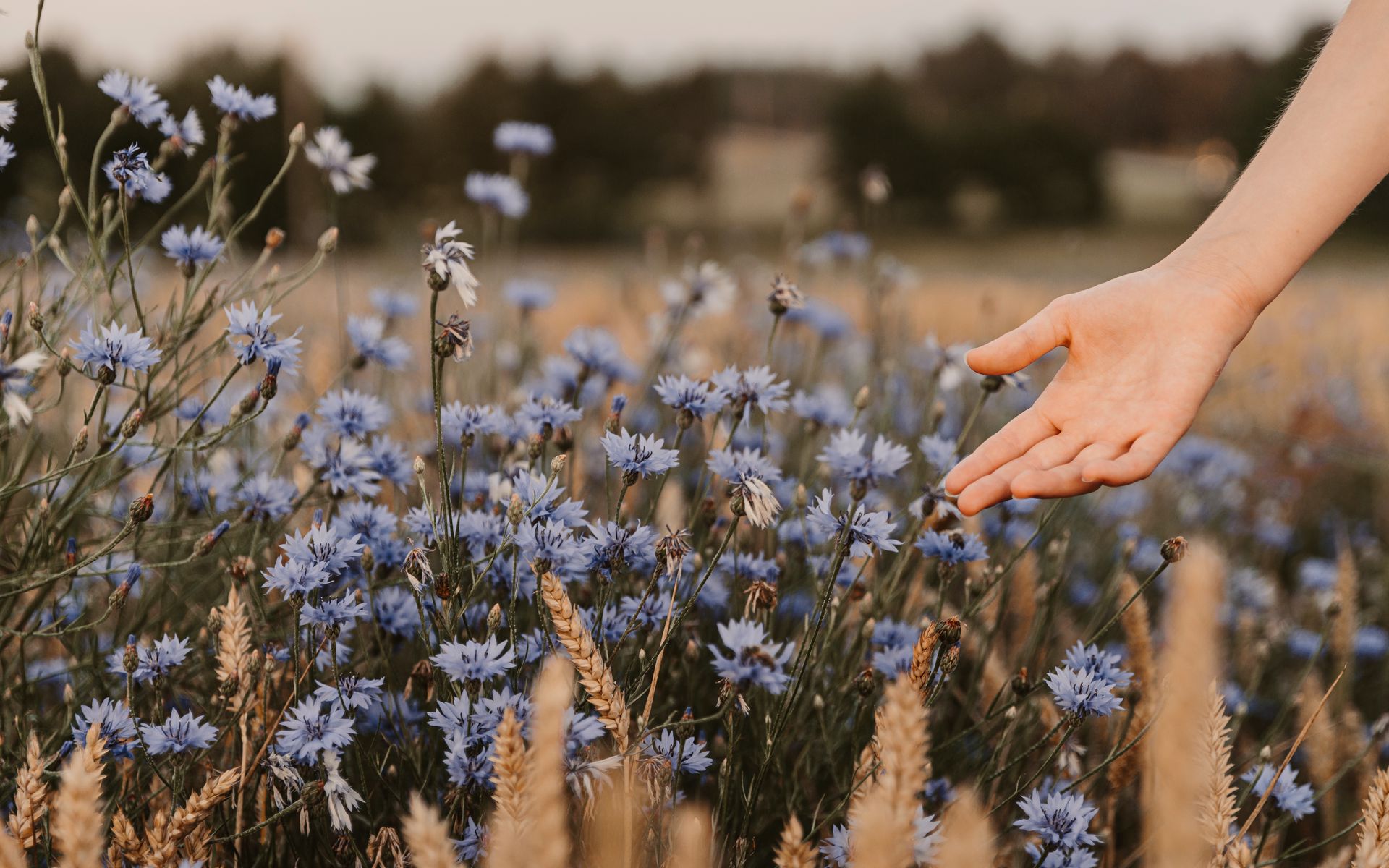 1920x1200 васильки, цветы, рука, колоски, поле обои 16:10